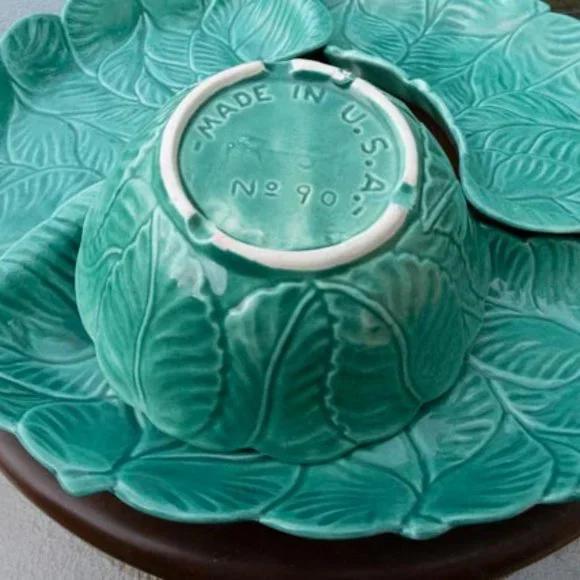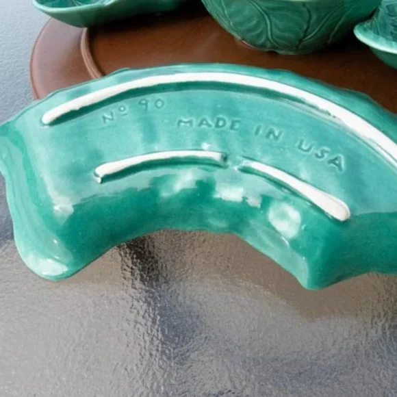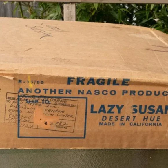 In excellent vintage condition, one MCM Nasco of CA Desert Hue Lazy Susan 5 Piece Set No. 90 consisting of center bowl, three side dishes, one turn base in original box. This set has no signs of wear nor damages from use such as cracks, chips etc. The only issues are manufacturer produced, due to the nature of the handcrafting process. There is an air buble on the center bowl, and an indent on one of its feet. In some places, the glaze didn't cover the porcelain, or the color came out too thin. There is a superficial crack on the back of the turn base. All of these are documented in the photos, please ask questions if anything is unclear.
