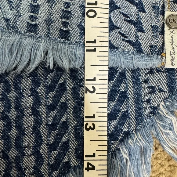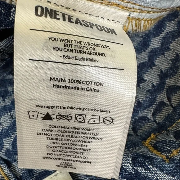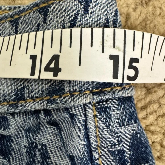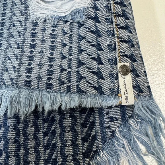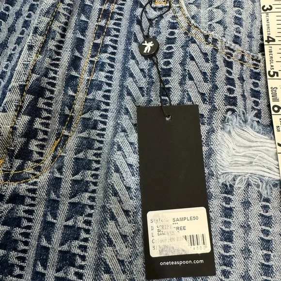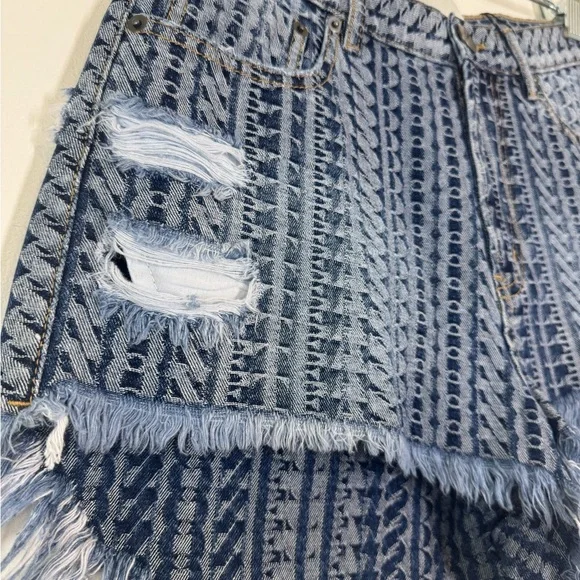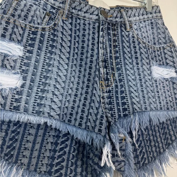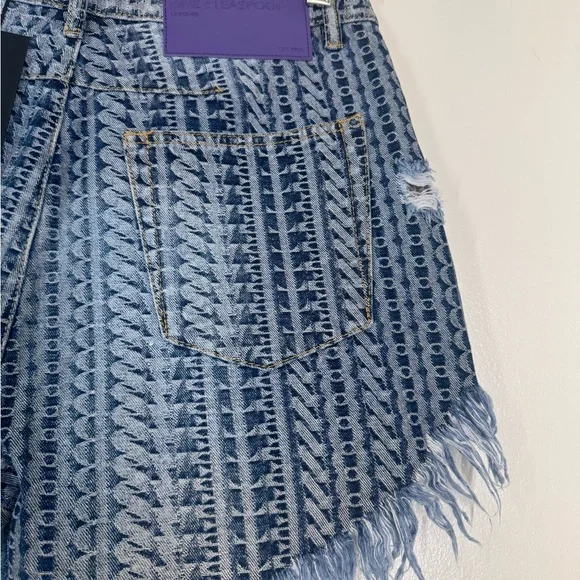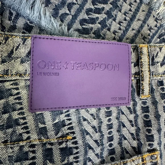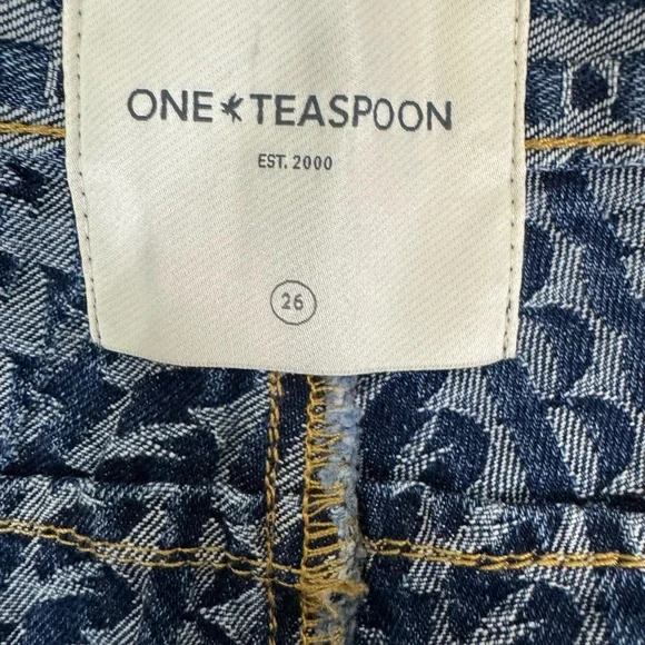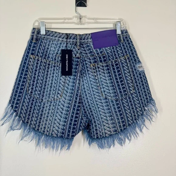These One Teaspoon blue jean shorts showcase a unique blend of distressed detailing and patterned embellishments, creating a standout look. The high-waisted design and frayed hem add a touch of vintage charm, perfect for casual outings.Brand : One TeaspoonSize : 26 Retail : $129 Style : Distressed Jean Shorts with Frayed Edges High Rise / High Waisted High - Low Design in front and back NEW WITH TAGS - this item was a sample Excellent condition